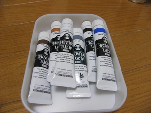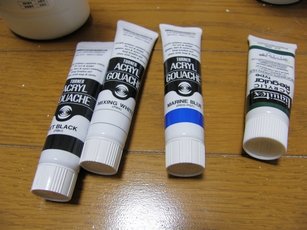 使うのは緑系のアクリル絵の具に、青、黒、白のアクリル絵の具です。